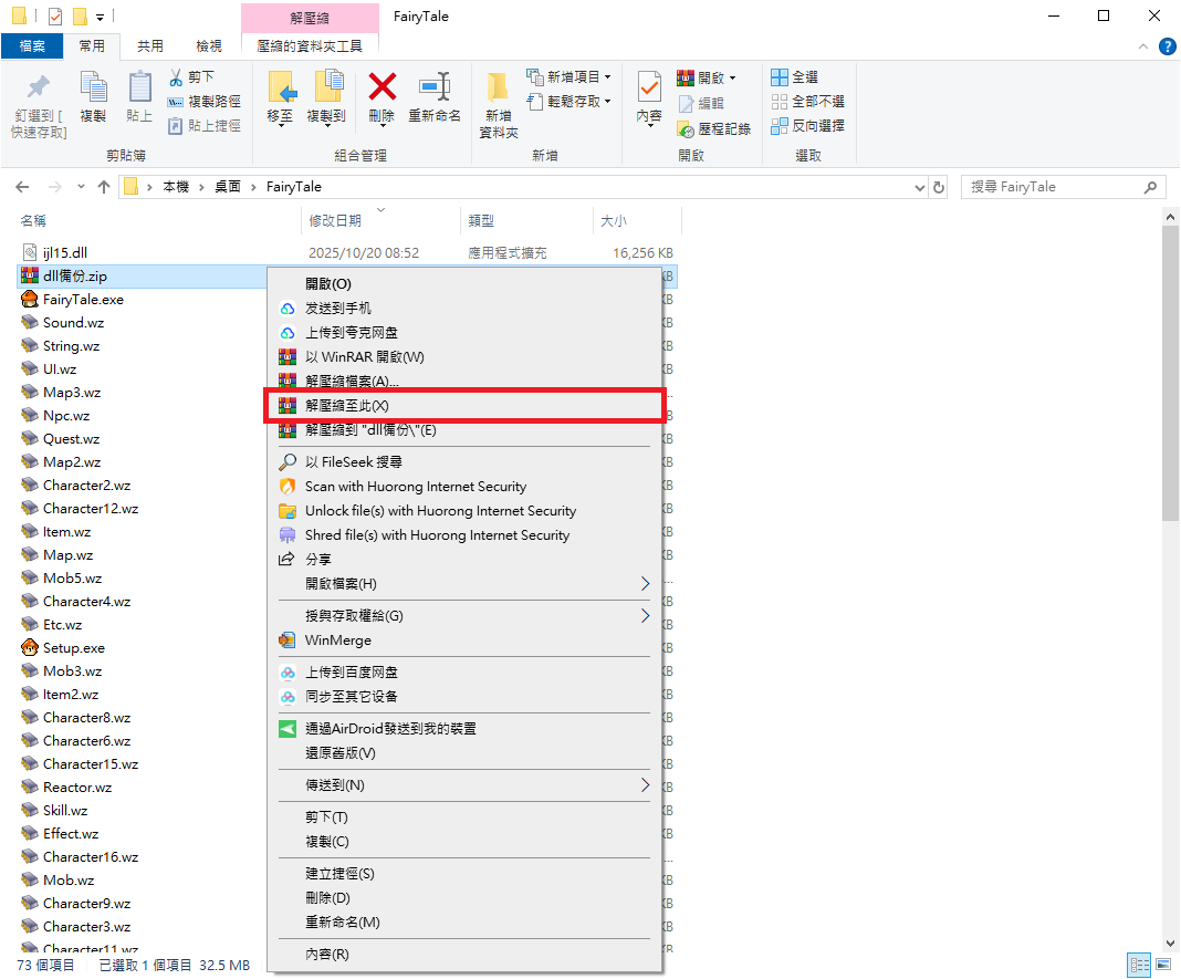 6.打開【遊戲主程式】資料夾,找到【dll備份.zip】檔案後使用滑鼠右鍵選單選擇解壓縮至此
