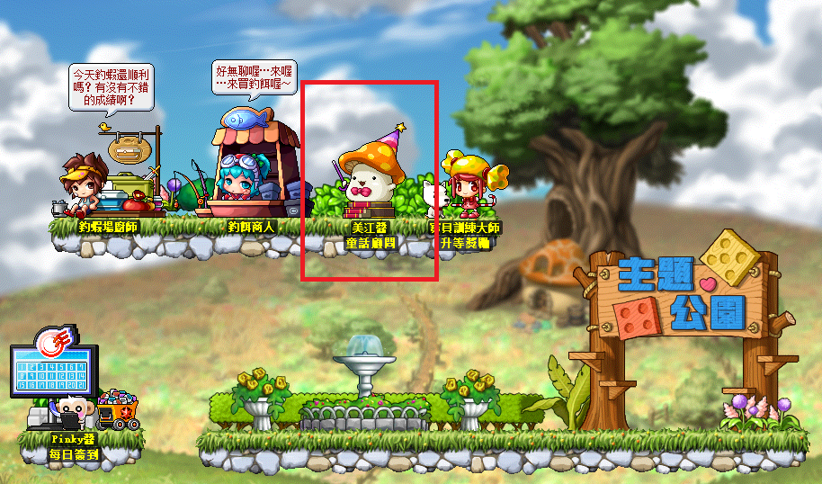 前往自由市場入口左上角即可看到童話顧問的身影,如果不知道怎麼上去上方平台,注意下圖中飯店門口有一個隱藏的傳送點喔!