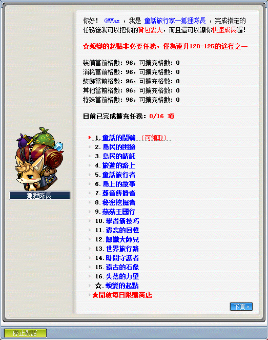 ※需依照順序依序進行所有任務串,全部完成後即擴充完所有背包欄位,且角色可直升至120等級。