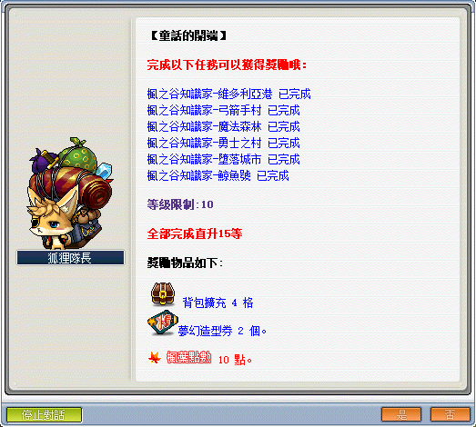 『進行任務內容』─完成指定的任務串,不只可以完成背包的擴充獲得如圖所示的道具及點數獎勵,以及等級直升的快速成長獎勵。