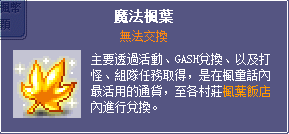 2.全伺服器狩獵怪物低機率獲得黃金楓葉,集齊10片可兌換為魔法楓葉