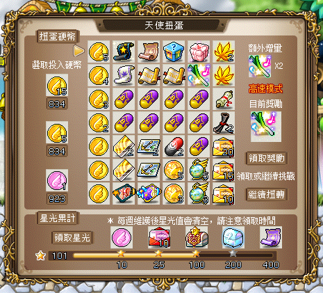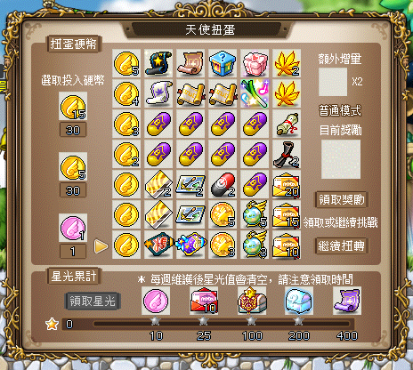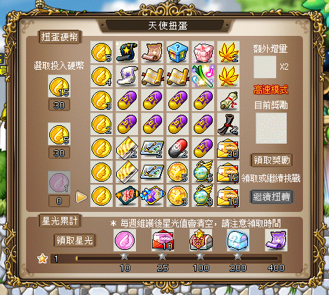 1.玩家每次領取扭蛋獎品時,可獲得星光值,當星光值達到指定數字時,即可領取一次對應的獎勵