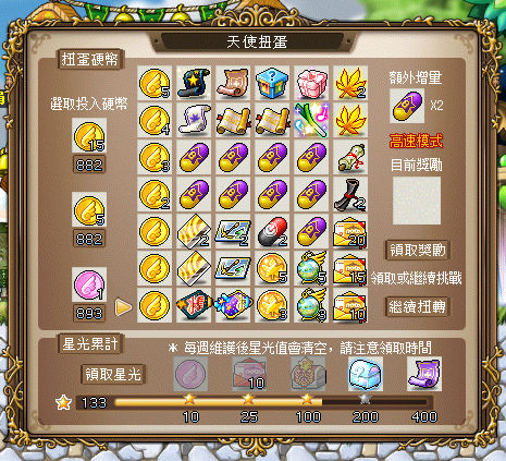 如果你想更節省動畫時間,更快的抽取大量扭蛋,可以善用高速模式,只要是非扭蛋中(沒有目前獎勵可領)的狀態下,點擊普通模式或高級模式就可以在兩個模式間切換,高級模式時,每次扭蛋會額外消耗 10 楓葉點數