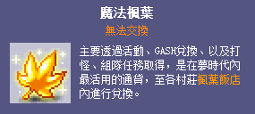 - (弓箭手村、墮落城市、玩具城、神木村…等地都可以進入楓葉飯店找瑟妮用魔法楓葉換道具或卷軸)