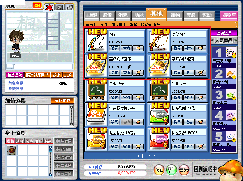 釣竿須前往購物商城使用遊戲點數購買,高級釣餌罐頭也是從此處購買,如下圖所示。
