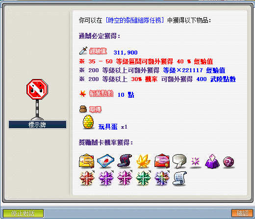 - 在 35 等後也可以組隊進行「時空的裂縫(玩具城101)組隊任務」,還可以機率獲得稀有獎勵,詳情可查看組隊任務攻略。