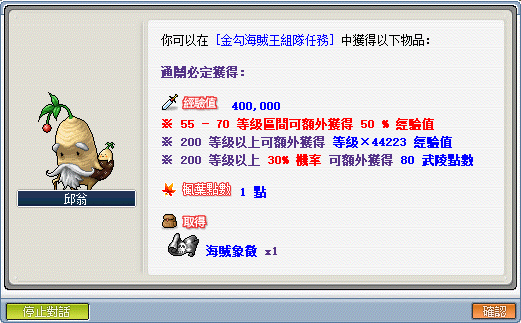 - 當然在 50 等後也可以繼續進行「毒霧森林組隊任務」至 55 等銜接下方的「金勾海賊王組隊任務」。