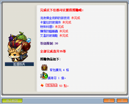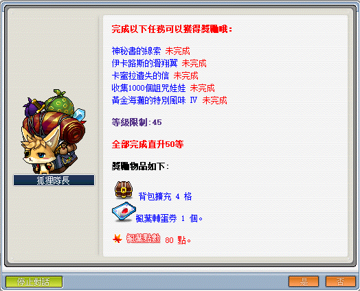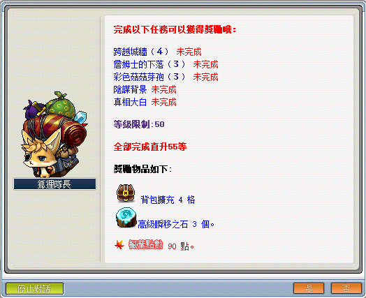 - 達到 50 等時,可依序接取狐狸隊長─《菇菇王國行》快速直達 55 等。