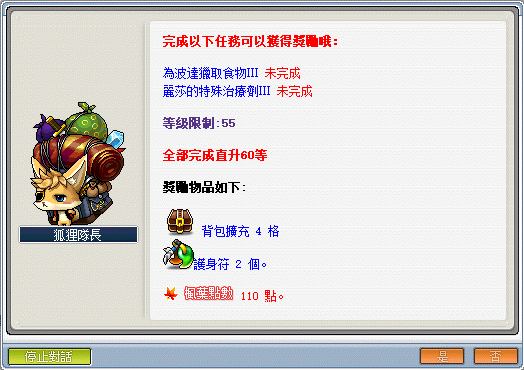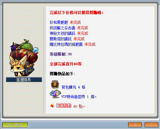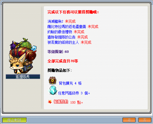 - 達到 60 等時,可依序接取狐狸隊長─《遺忘的回憶》快速直達 70 等。