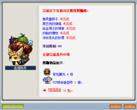 - 達到 40 等時,可依序接取狐狸隊長─《聲音傳播者》快速直達 45 等。