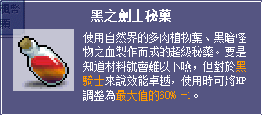 ※黑之劍士秘藥─楓童話專門為黑騎士所打造的特殊藥水,搭配其四轉的獨特技能「黑暗力量」所開發的新品